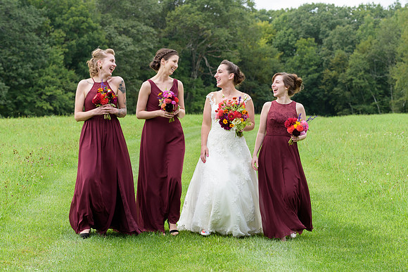 Bride and bridesmaids walk through the fields for rustic wedding in Goshen Connecticut, Litchfield